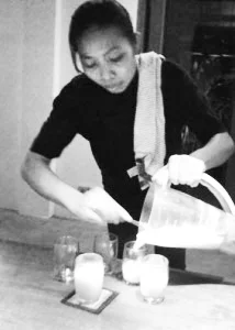The main indoor space features a comfortable lounge area, divided by an asymmetric Japanese cabinet from its grand dining room and fully equipped open kitchen. The ceiling fans and sliding glass doors provide a soft breeze flowing through. A glass-lined corridor connects the two master bedrooms, each with their own king-sized bed and private bathroom with rain shower.